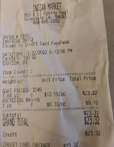 FYI....I had a really bad experience with this Indian Market. In August for buying some item and I have given 100$ and received change of more than 80$ as per I remember..in that their was one 5$ note which was tired into half and had a plaster on it, without knowing I have taken it . And after came to know it was tired into half I thought next time when I go to the store I can ask for the same. Unfortunately today I went and explained the whole situation and asked to take the $5 , but the same shop keeper denied that it was given by him....here the matter is not for 5$ it's about the trust was have toward the Indian Market Sunnyvale branch, now I got less trust on this store... I request people to verify the change properly before leaving the store. Have a...