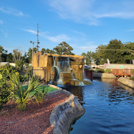 Read moreThe pricing is fair for a putt-putt course with two optional courses. $9 for adults, $8 for 12 & under, free for 5 & under. Half price for a second round (on the other course) in the same visit. Beverages available from the cooler. The owner/operator was wry, but friendly. The course is simple, some features made it fun & laughs are sure to be had. Some features need repair to make them slightly possible (the cement hump with a slight channel to aim for...the lip that you would have to hit is missing, so your ball just bounces off.) The occasional hole in one's made things exciting. Sadly, the turf is quite worn on most holes. From the tees to the near-hole locations, lots of duct tape (matching green) covers the sub-par surfaces. At the 17th hole of our second 18, I finally realized that all the skinny wood posts near each tee used to be Tiki idols (a LONG time ago). See photos. The lagoons are a nice touch, the blue water adds to the ambiance. Unfortunately, several patrons have tossed their garbage in the water. Not cool. If there were a few trash cans throughout the course, perhaps the slobs who visit the venue wouldn't litter so much. We packed out our own trash, because our mommas raised us right. The best laugh of our visit was seeing that there are auto repair services offered on site as well. (See photo for a chuckle.) Over all, we had a good time. Our second round went a bit long (15 minutes after close) but the owner was gracious and forgiving. We come to Topsail every year, and always try to patronize locally owned businesses. We will...