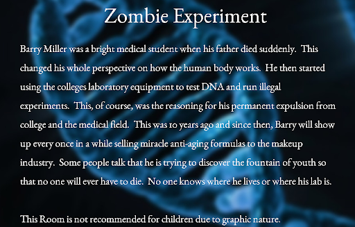 Zombies 4/5 stars Very good, a little challenging without causing any major hiccups. There were some things we needed hints on because we had never seen a puzzle like that (possible spoiler: innocuous item in room was actually part of puzzle, kept overlooking it, especially because they said nothing will be over my head- and I am quite short and took it very literal). The one star off is for the final puzzle that requires math skill. My partner is a math major and started to brute force the puzzle, writing out the equation, but we were at