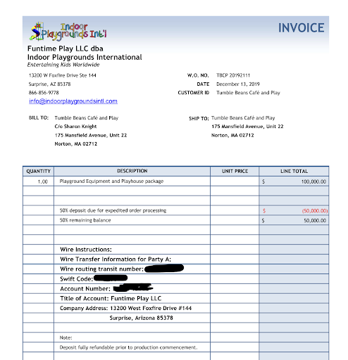 The initial deposit for this play structure was $10,500 and we were going to finance the rest through a lender THEY recommended.