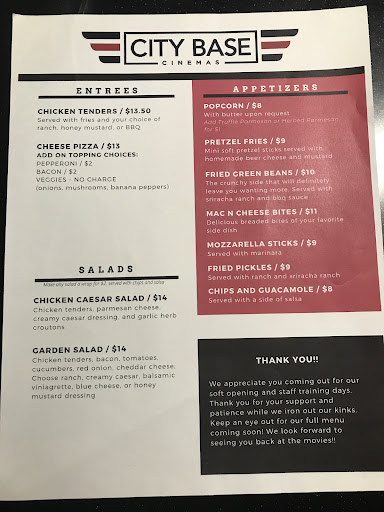 Once you make it inside and want to order, it's time to see the menu - a crumbled piece of paper with a QR code that's sometimes a pita to scan. Why this can't be thinly laminated and adhered to the food tray, I do not know. And that's if you even have a QR code on your tray. Sometimes it's missing, so you have to grab one off another seat. When City Base waitstaff finally brings the order, they're standing upright in front of you while trying to figure out how to set plates down. Envision waitstaff would at least kneel down and stay off to the side of the seats while taking/giving your order. I typically order two items to eat myself, and almost every time, City Base waitstaff has sat the second item on the seat tray beside me...even so much as 'giving' my food to strangers. Plenty of room to sit both on a single tray. So even though I order for a single seat, still deliver my meal to the seat next to me? Doesn't make any sense. Also, why are we not at a point where receipts are texted? Menu is a QR code, so we use our phone. But receipts are paper only? I remember Envision waitstaff used to sit receipt pads on the trays/plates while crouched down, having consideration for guests watching the movie. City Base waitstaff goes right in front of the seat, standing upright, and sticks it out in front of me so I have to grab it. Why can this not be sat on the tray? Does waitstaff notice we're in the middle of watching a movie, eyes glued to the screen? Or do they want to interrupt us 30 minutes before it's over?