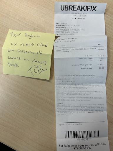Before I approved the repair, I asked about liability in the event that UbreakIFix damaged my phone.Anthony assured me that the store would repair any issues that happened as a result of the screen repair. He told me that I would not have to pay, but it may take a few days to order replacement parts should something go wrong. That seemed reasonable to me, so I allowed the repair to proceed.