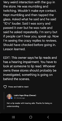 Instead he said, "Thanks for telling me, let's talk about it, and please tell me how we can best meet YOUR needs and make you a happy customer who enjoys coming in."
