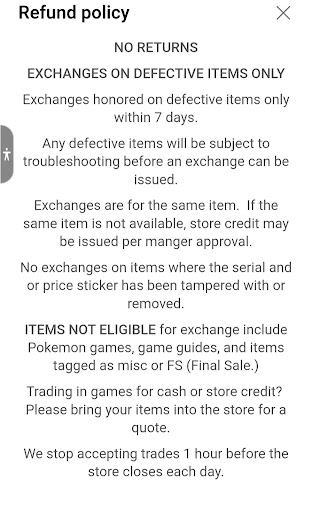 I would highly recommend not buying high priced items from this store because you would not get your money back on it. Especially for a game power blade 2 trying to sell for over a 1,000 when can be found for 20 to 40 dollars online. Anyways, if you are buying from them, ask them to test the games in front of you first before buying. I attached their return policy which wasn't shown at their register in full, fine print left out they probably will post it up after seeing this. Or buy a cheap item, see receipt they send through texts to read return policy before considering to buy high priced items. Buying from a multinational store is better off.