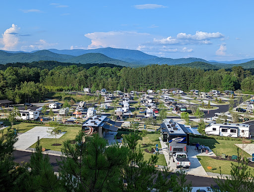 Details Stayed in July 2022, site #E28 (paid avg $150/nt) The Eagle Crest section is on a high plateau so you have incredible views of mountains for miles. The other 2 lower sections (Falcon Ridge & Hawk Valley) are nice, but the views aren't quite the same in terms of grandeur. Amenities & conveniences include: Pool, hot tub, sundeck, exercise room, dog park, pickleball, gated/key card, trash pickup Big rig friendly, LONG concrete pads...might be some of the longest sites in Guinness records! Great WiFi, seemed to have QoS as speed was still 25Mbps+ even at near full capacity Water pressure at 40-50psi, solid/stable 50A power A lot of nearby sight-seeing and attractions within 20-30 min driving (Blue Ridge, Apple orchards, Carter's Lake, Amicalola Falls, etc.) Unique site/landscape lighting throughout with color changing LEDs Typical limited privacy between sites characteristic of a new development Additional $25 fee required to guarantee a specific site (more resorts are doing this facilitated via campspot reservation platform)