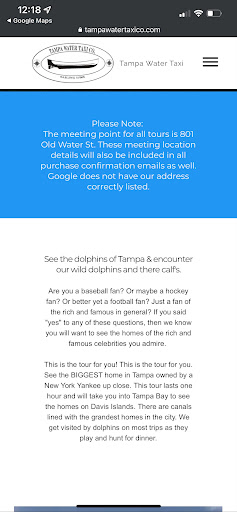Read moreBooked my tour through Viator. Received a confirmation text from Viator with the address of the dock. Upon arriving at the address provided, I realized there was no parking. Not being familiar with the area, I called the number on my confirmation text. I was told that parking was 2 blocks away. By the time we found parking and walked the 2 blocks we had missed our tour. I later discovered an email sent at 8pm the night before (by the actual tour operator) with instructions for parking. I was not expecting an email as I had already received the confirmation text with an address. I emailed Viator requesting a way to either rebook the tour or get a refund, but I was denied. I contacted my credit card company to dispute the charge. I then received an email from Viator threatening to send me to collections!! I'm sure the water taxi company is wonderful, all the reviews are great. However, due to their choice of using a third party to book their tours, I was never able to experience their service. To be threatened with collections for $60 was shocking. They literally could have offered a chance to rebook the trip and I would have been pleased. Unfortunately I was strong armed by an invisible company all while destroying the reputation of a locally owned business. Very sad. Because of Viator, Tampa Water Taxi will never get another dime...