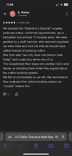 Unfortunately we were unaware that our system was not booking the couples massages correctly. It was only registering as one person was booking, and was not requiring a second therapist to be available. So when they came in, it only showed one person booked a couples apt and another therapist was not available. I explained to them the issue with our system, and yes I mentioned sometimes it is best to call. But I did not say it in a nasty way. I could tell at this point they were very annoyed that they both weren’t booked.
