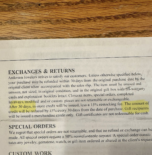 We have done business for several years at Anderson's with the previous owners and were always well pleased with the quality of service. Dave and his staff were courteous and always provided exceptional customer service. Unfortunately we are very disappointed with the new owners and will not be doing business with them again as a result of a recent encounter. My husband and I took our rings in to have them checked and repaired on October 16. We were told that the jeweler would be in on the following Tuesday, 10/19 and she would call us to let us know the cost of the repair if any. I received a call from Heidi, the owner on Wednesday, October 20 saying that the rings were done and the cost of the repair. I told her that we would be over on Saturday (since we both work and live 30 miles away). I asked her the store hours on Saturday and she said 9-2. We arrived at the store about 12:30 on Saturday 12/23 and there was a sign on the door saying they were closed to attend a wedding! I'm sure the wedding wasn't scheduled at the last minute! To add further insult to injury, my husband and I both called the store and her cell number multiple times starting on Monday the 25th, leaving messages at both numbers and received no response. FINALLY late in the afternoon on Friday, October 29th, Heidi's husband called me and assured me he would be there the following day from 9-2. He never really apologized for no one returning our calls, just said that yes, he had to leave to go to the wedding on that Saturday. When I went to pick up the rings, I was the only customer in the store and again he did not apologize or address the issue in any way. WE ARE DONE...