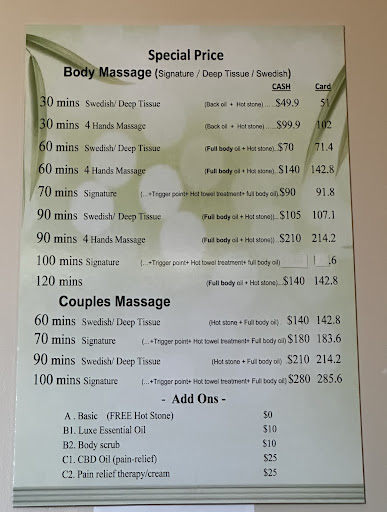 Read moreI had received a gift certificate from a pass GF for my birthday to try this place out. I felt like I had entered into another world with an Asian influence. I mean that as in a good and pleasant experience. I called to set an appointment and showed up. I opted for deep tissue and it was a good massage. I have never experienced anyone walking on my back nor the use of Hot stones and cloths. I was great and I will be back. Very kind and respectful staff that made sure you were "OK" while you are being massaged. As for those that have an issue with the language barrier. I suggest you get over it and work through it, not a big deal nor a good enough reason to not go. As some people have mentioned here, they are learning. To judge the establishment for that is Plain foolishness... they know enough to get the job done right. Getting a massage doesn't require a long drawn out...