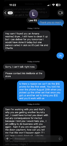 Read moreNo stars if it were an option. I would not recommend the Thomasville Rent-A-Center location. Their website gives you an approval amount, but the store doesnât honor itâthey pick and choose who they want to rent to. Whatâs the point of the online approval if theyâre going to disregard it? We had a washer and dryer that Lee picked up on August 20th, promising he had another (slightly cheaper) set available to deliver. As of September 22nd, we still havenât received it. Every time we call, the story changes. The staff is extremely rude on the phone, and if they say someone will call you back, donât count on it. No one is on the same page, and youâll get a different story depending on who you talk to. Thatâs not customer serviceâthatâs poor communication. On September 20th, we were told delivery would be made September 22nd between 1â3 p.m. The day of delivery, I called the store and was told Lee had come by but no one answered. My husband called Lee directly, and Lee admitted he never even came to the doorâhe sat at a corner and watched another company we rent from knock on our door. We have five kids under 6, so if weâre in the back of the house, we may not hear a knock. Thatâs understandable. But instead of handling it professionally, Lee tried talking to the other company about our account. They refused to disclose private customer information, as they should. Then the story shifted againâthis time we were told we couldnât rent anything until we showed proof regarding our account with the other company. If that was the real issue, why wasnât it mentioned on the 20th when we made the payment? Now weâre stuck waiting on a refund. To top it off, if youâre ever behind on a payment, theyâll beat on your door like the police, ring your bell repeatedly, and blow up your phone while sitting out front. But when it comes to their promises, suddenly thereâs no urgency. Bottom line: Take your business elsewhere. This location is unprofessional, disorganized, and does not respect customers. some of the messages dealing with this...