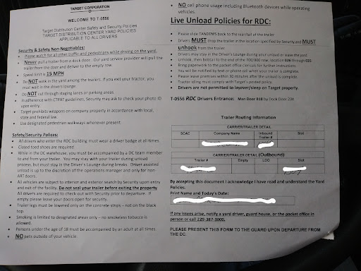 Read moreMy appointment was at 08:00, and I arrived at 08:05. I Checked in at the guard shack. You must have your driver's license to check-in. They give you directions to drop your trailer in the slot in the yard. Then you drive to the bobtail parking area and enter the door to take your paperwork. They said they would give you a call when your trailer is ready. You have to leave the premises because you cannot stay there. But there is a pilot truck stop up the street, which makes things convenient. But when you run out of hours, you must sit at the pilot until your trailer is done. Then you go pick up your trailer. It is now 14:45, and my trailer still needs to be prepared. So I called the number on the paper gate pass they gave me to find out if my trailer was ready. The lady who answered the phone told me it was almost finished and that they would give me a call when my trailer was ready. I asked if she did not mind telling me what took so long for my trailer to be unloaded. She kindly said they had to build the pillows as they took them off the truck. This is insane! Why make the driver wait so you could build the pillows as you take them off the truck? I am totally out of hours. So do I go from here? I WILL NOT BE DELIVERING TO TARGET...