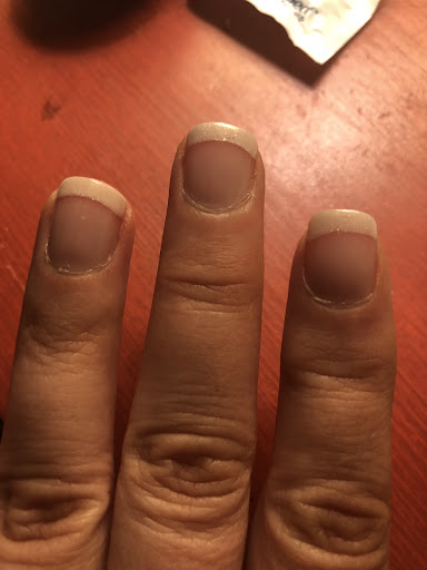 IF YOU CARE ABOUT YOUR HEALTH PLEASE READ!!!!! The pictures you see are from a manicure that's a week old! I PAID $36 and just now hitting a week! I WILL SHOW YOU MY BANK STATEMENT IF YOU WOULD LIKE! When I first stopped in here to check out the prices they were so friendly! They offered me a drink, they were not pushy, they were very patient. When I came in and got my nails done it was the complete opposite. I had to ask for a drink and I was rushed into choosing my color which made no sense because they were not busy and the lady had not even started with my nails! I chose the purple color with the white and a pearlescent white with purple glitter in it! As I put my hands in the lamp to dry my nails it burnt the Dickens out of me! So I pulled them out which is what the lady told me to do! I had to go to my doctor. I called to tell her this just to let her know so that she knew it burnt my mail beds so that it didnt happen to other clients and she insisted that UV light doesnt burn people and she became defensive and said she has done nails for 22 years! CORRECT! But my doctor, who's been a doctor for 37 years, explained that it was the chemical reaction caused by her rushing through the process and globbing one thick top coat on versus her taking the time and putting on 2 thin layers of top coat! I even tried to explain to her that the white nails turned yellow! She treated me like I was ignorant and told me the nail polish had a little bit of yellow in it! WRONG! NO IT DID NOT! It was a Pearlescent WHITE! PERIOD! AND WHY DID THEY TURN YELLOW???? FROM OVER CURING??? The pictures I posted tell the whole story! Streaky sections of color, bubbles, jagged raised sections of nail polish and being burnt due to a chemical reaction; all due to globbing on top coat because she couldn't take the to give me a quality manicure! NOT WORTH THE $36 I PAID! MY CUTICLES ARE A MESS! Do yourself a favor and go somewhere else! She did not even offer to redo my nails! I tipped her $12, paid $36, I have had to pay for a prescription burn cream and a co-pay for a doctors visit because of her negligence and she treats me like I do not know the difference between white and yellow. Makes my Doctor out to be a Moron and does not even care that my nails could look better had I of done them for free at home a week a go. So sad how money hungry some people can be! Absolutely no customer service skills...