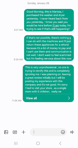 Read moreBought washer&dryer from them approximately 1 year ago. They were used, but worked fine overall except 1 foot being stripped. But an employee that was friends with the owner took my number and used it for personal reasons, and didn’t stop messaging me til I reported him to the manager. Now 1 year later I do not need my washer&dryer anymore because I’m moving. I contacted this business asking if they wanted them back. They asked me what I wanted for them. I said $50 each but you’d have to pick them up. They said that sounds great but sure enough gave me a run around til they finally picked them up. But they never paid me! I tried contacting them threw email because talking to them gets me nowhere and the first I sent asking if they were interested in the unit they responded well to. But now they just ignore me. Had a friend go in the store because I couldn’t make a trip to the store and they lied to my friend saying I donated them. I NEVER once said it was a donation they just refuse to pay me a total of $100 for a working w&d. This is not a business I will ever recommend. They are very...