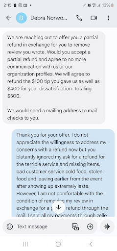 Below in the photo section is where the owner reached out to me offering to give me a partial refund and now somewhat acknowledging the wrong she did and the mess of a service she did. I assure you, everything above is true and accurate and I beg you to please do not allow her smooth talking to finesse you into using this catering service. Go through the reviews and steer clear. Updated photos of her...