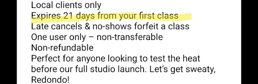 I thought the class pack lasted 21 days from 1st class, as highlighted in the attachment below. Apparently they started the timer when I bought the package.. which was while I was out of town starting a new job orientation. No problem, it happens; I've had one hot yoga place in the area generously give me a 6 month extension once on my credits, so I'm sure something like a 1 week extension here would be no problem?