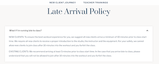 I enjoy the new studio and friendly instructors however was disappointed with the lack of communication on their website and third party apps. The instructions on parking weren't readily shared on the booking confirmation, I arrived at the studio slightly late due to parking and showed up exactly at 9:07 for a 9 am class. Because I was 7 minutes late, I was rejected and told they would not be able to let me in due to company policy. The two gals in front said "Due to policy we cannot let you in". I completely understand this rule and had wished it was properly stated on the booking confirmation so clients are well aware there needs to be ample time for parking and arrival.