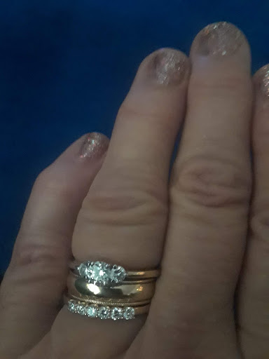 From the way things went when I came back in, I kind of felt like the saleslady didn't seem really enthusiastic about the idea, even though it meant the store would make more money off of me! But I might be imagining that part. In any event, I wound up picking 3 new stones, of which two were from stud earrings, only .10 of a carat, and one was a larger stone of .40 of a carat. I wasn't offered a new setting (the band was/is very narrow, and I think a slightly less narrow band would have been better for three stones) but told that they could redo the current mounting to hold three stones.