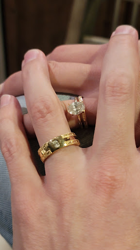 I'll start off by saying that the vibe is much different in here vs. a traditional jewelry store, and I mean that in the best way possible. They are so easy to work with, no pressure, and amazing at taking your vision and making it a reality. My wife came in with some pretty strong design ideas. Jess grabbed a pen and paper and started sketching things out right then, changing things slightly where necessary based on her experience. After producing a CAD model of the design, and working within our budget to get the right sized diamonds, they got to work and came back with a beautiful ring. She's always getting compliments about it wherever she goes, and I think the pictures speak for themselves!