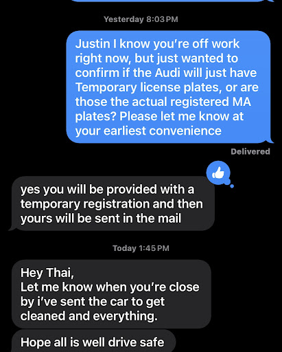 Upon arrival, we had to wait about 30minutes before seeing the little finance guy āArnoldā I believe his name was? He slaps a piece of paper stating why they cannot release the vehicle due to Boston DMV requirements, and says weāll need to go back to Boston to submit all these paperwork and get the plates ourselves. The manner in which he delivered this news almost seems as if weāre the ones in the wrong. We explained that we spoke with Kerry and Justin who assured us this will not be a problem.