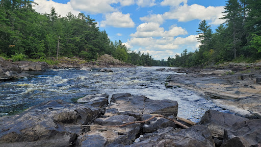 Very intense and dangerous rapids/waterfall. There is "RIP NED" written everywhere, so this is not a place to goof around because in a split second, something could go horribly wrong. So, please take extra caution to were you are walking. There is 2 different trails leading down to the waterfall. The one on the the left has a steep incline down and the one on the right has steps and goes down gradually. There is a foundation from a bridge that use to connect the states at this point. Below the waterfall is a good fishing spot and there is a boat launch south of the falls if you want to fish by boat there, which is preferred, to get to hard to reach spots were the fish are...