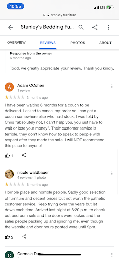 Read moreI will never shop here again! My parents furnished their home several times over with Stanley but their customer service and morals have gone down hill. Bought our very first piece of new furniture with them. The dining set came damaged. I called immediately and was told to bring the chair back. The company that makes the chair said it should be replaced. Stanley's told me they would replace it but painted it instead and in doing so damaged the three lower rungs of the chair. They had left the chair in our back mud room. When I saw the horrible repair job which was also a different finish then the rest of the chairs I immediately called and brought it back. They refused to replace it and instead "repaired" it again. The new repair paint scraped of the chair with a wet sponge. Needless to say it went back again and when I went to pick it up yet again it looked exactly the same. I discussed my disappointment with a salesperson who agreed it was not acceptable when another salesperson (Chris) approached and began insulting me, telling me it's my fault for wiping the chair, and was very agresssive and rude. My preteen son who was very upset with how he was speaking to me began to ask me if he should call the police or my husband or begin videotaping the salesman as he was so rude and aggressive. The salesman then told me I should teach my kid some respect. The original salesman had the decency to look embarrassed but the owner was sitting near by and ignored the entire exchange! I left the store as it was very upsetting and the salesperson was continuing to get more abusive and now attacking my child. I went back again today to just try and get my damaged chair and the same salesman was there. Needless to say he was again rude and lied several times. Do not waste your time or money here. Rude liars with the worst customer service ever. Do yourself a favor and look up the number of small claims against them too. Wish I had. Response by the store below is full of inaccurate remarks. Canadell reported that no claims were received and had they been the chair would have been replaced immediately. We gave the name of the representative. The long and short of it is that the chair should have been replaced on day one and the aggressive rude behavior of Chris is unacceptable. Yes it has been 4 years but that is because we have had to continuously bring the chair back for poor repair(i.e. Mismatched color, they sanded chair and the sprayed over the sanding particles without wiping the chair down leaving it gritty, the repair paint coming off with the wipe of a damp sponge, once the chair was dropped in our mud room with the repair never completed ) and we had several times that we attempted to pick up the chair and were told it was sent back to warehouse or we couldn't come on the weekend. Not to mention I no longer will go back alone after the way I was treated. When I left the initial review I had gone to the store that day where I was again met with lies and aggression and was ultimately told they were not replacing or fixing the chair and would call me to pick it up. Still waiting on that call. I will not respond to any further remarks by this store. They...