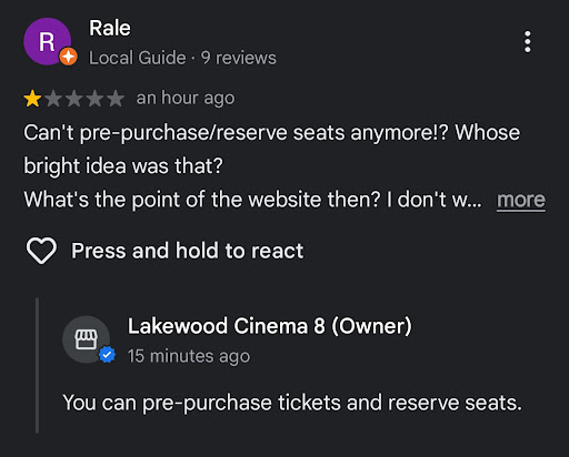 We had to go inside to get tickets as no one was at the ticket booth. Then had to wait while teenagers ordered and received their tickets and snacks. My mother uses a walker so the extra time standing was hard on her. There were 3 staff behind the counter so I’m not sure why they couldn’t offer us assistance while the teenagers were being served. We paid over $50 bucks for two tickets and two drinks and a popcorn to share. No senior discount was offered. The woman staff member just made a comment about it being a super long movie. The staff just said the movie is that way and pointed to the left side and it was not clear which theater we were to go in. They didn’t seem that interested in helping customers but wanting to chat amongst themselves. This was a movie that started about 3-4pm. Even another family seemed confused on what theater to go in. The theater was super hot and they had the movie playing extremely loud and I don’t mean movie theater loud, I mean it was so loud some people left (also due to the heat!). The seats are super uncomfortable and absolutely no leg room what so ever. Super stiff and in an awkward completely upright position. Then the teenagers were constantly screaming details out about the movie and not once did a staff come check on things. Thank goodness they left midway through. Never again will my mother go back and not sure if I would either. Also the movie started late and they ran so many commercials at the beginning. The price alone was outrageous! I was hoping for a pleasant experience for my mother who doesn’t leave her home often. The only good thing was the...