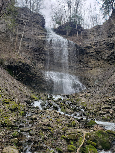 This falls us best seen in the spring and early summer after a good rain. It will be reduced to a trickle during mid to late summer. They can either be seen from the cliff at the top trail or you can take he horseshoe shaped trail down to the base. It is a rather easy walk. In order to reach the base of the falls you have to traverse some loose stones by the creek but nothing too challenging. In the spring it is worth the hike to the base. Steer clear of the vines hanging around the trail because the ticks love them. Had 3 on me after touching them. Other than that it was a beautiful site. Hope you...