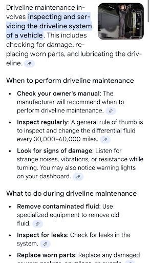 I must say in all fairness, I had a very good experience here with a guy I’m assuming was the manager last year, when they did a state inspection, and I spoke to one of the mechanics on both occasions and he’s a good dude, but the young guy behind the counter on this visit has no business in customer service, and I think he probably lied on his resume if he didn’t known what the driveline on a vehicle is. Included is a screen grab from Google explaining what Driveline Maintenance is so that the joker at Monro can see that it’s not dealership specific and is actually a generally accepted term in most mechanic shops. Anyways.. won’t be coming back for routine maintenance or any...