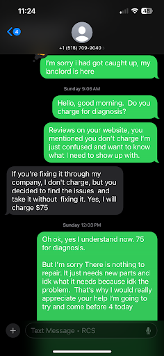 My issue was very clearâI needed my PC diagnosed and fixed. Instead of giving me a proper diagnosis WITHIN 24 HOURS, you told me i havenât found the issue yet, but it would be $200 minimum. When I asked for an update on diagnostic and requested you let me know what you find before making changes you became rude and dismissive, saying, âWhy did you bring it in if you donât want to pay?â When all I asked was a diagnostic update after 24 hours