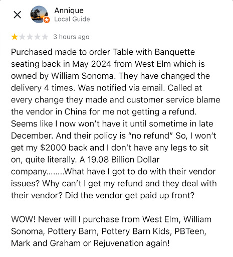 Read moreUPDATE: After posting my criticism here and on FB, I received some help but that did not last very long. Despite the store manager's promise that the unauthorized $134 transaction would not be disputed with the credit card company, I learned today that the West Elm corporate office indicated that this was a verified transaction. Please do not shop at this store unless you want to end up dealing with months of back & forth over fraudulent transactions.