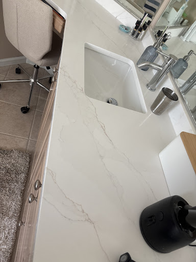 Happy to leave Thruway Stone a 5 star review! From the salesman we worked with when we walked into the store, to the staff who worked up multiple quotes multiple ways and then had to redo them because life intervened past 60 days, to the very professional and personable gentleman who did the template, and finally to the installers, 5 stars all the way. We had a great tour of the facility, loved seeing their collection of large slabs, brought home samples, and are so happy with our choice. We had a lot of input from our sales person who was very knowledgeable, happy to brainstorm, and problem solve with us. Over the next few months any questions I emailed to Thruway were promptly answered. The installers arrived on time, introduced themselves and did a beautiful job putting everything in place. They had a few issues to work carefully around and had no problems. I have samples of paint on our MBR bathroom walls, thus the strange angle showing our new counter. Same thing with our guest bath. Lots of repair work to be done, but I really love the way the quartz ties things together. Paint...