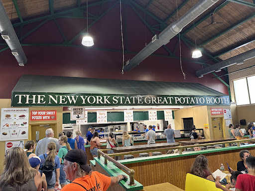 So far I have never had to wait for a $1.00 baked potato. Portions are hearty. Venders, what little there are,are very friendly, and talkative. All sharing major concerns of profit loss. The rest of the building is occupied by State run entities willing to welcome visitors. I spent a considerable amount of time talking to a few about tree/plant management issues I am experiencing in the yard. Other than that the building is largely vacant with areas blocked off by curtend stanschions. The Tram drop off behind the building near the rail road tracks is a great asset when entering the Fair from the Handycapped Area between gates 10 and 11. Access to other Trams that transport visitors around the Fair is provided. A short walk from the stop to the front of the building provides close access to the entertainment area...