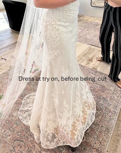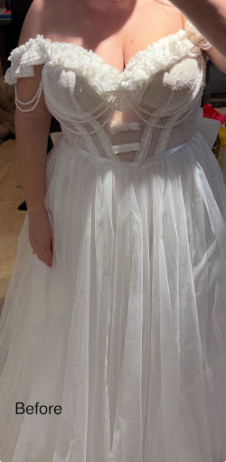 Read moreDo not bring your wedding dress here. I was charged $1300 for them to cut off the front hem of my dress (which was not the plan to shorten it), for them to take in the dress, add the laziest bustle I’ve ever seen (just one eyelet hook and a piece of string to hang it on) and sew in what I brought as removable straps. I came in about 4 times to try on my dress with the seamstress and each time, something had been done that was not discussed. First, they cut off the front hem (see photos) to shorten the dress. After doing that, they then decided to take the dress in at the waist, thus negating having to cut the hem at all! Next, they added lace cups, which I didn’t mind all that much. But the lace they used was cheap and a completely different color than my ivory dress. At all of my 4 appointments, I asked them to charge the removable straps from an elastic loop and button, to snaps/fasteners. After they had my dress for almost 7 months, I picked it up for the final fitting and the straps has been sewn in. I had to take the dress back and ask AGAIN for snaps. Thankfully the one seamstress there who actually listened to me, was able to add in the snaps in 1 weeks. What I should have done then was check the snaps and see that the male part of the snap was left IN THE DRESS. Unfortunately, I didn’t do that and only discovered while dancing at my wedding that the remaining part of the snap was ripping up my back. So now I have photos of my back covered in tape from my wedding because a “professional seamstress” didn’t think to make my dress functional. I deeply regret bringing my dress here. I wasted my time and money on...