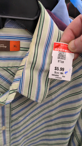 Goodwill sorts clothing only by color, not size! They don't copy sizes from the labels to their tags (you have to look). They don't measure unlabeled clothing (you'd have to measure or try on). Every tag in the store says "Size: NA" (no one thought to OMIT the size when it is NA?). Who can shop like this? Stock here is a little thin; they COULD exchange stock with other thrift stores. Many M and XXL shirts (few S, L, XL). Good prices.