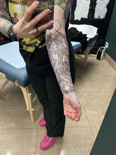 Read moreThis shop is clean, professional and funky, and on my various visits there to explore flash art for a tattoo I'm considering I've seen all kinds of clients getting inked. My boyfriend and I brought his niece in to get a piece done. She had an idea of what she wanted and Chris Koutsis worked something up for her on the spot and she loved it. As we waited for her and flipped through pages of flash we enjoyed some cool music and were digging the people-watching opps as customers came in and inquired about tatts or went to their appointments. Comfy couches, magazines and a public restroom all lend a customer-oriented and pleasant vibe to the place. Our girl walked out of there with a big smile on her face! She was given precise directions on how to care for the tatt as it healed and how to maintain its beauty over time. It is a well-run place and most of the staff is heavily tattooed which definitely made us feel like they knew their stuff and they shared it with everyone who came through. BADASS shop - I'll be pulling the trigger on my next one there...