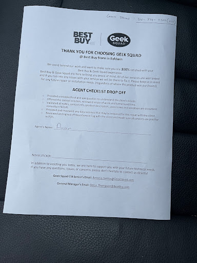 Ā Ā Ā Read moreI had a fantastic experience with the Geek Squad at Best Buy in Baldwin. I brought in my HP laptop for repair under my maintenance and warranty agreement, and I couldn't be happier with the service I received.