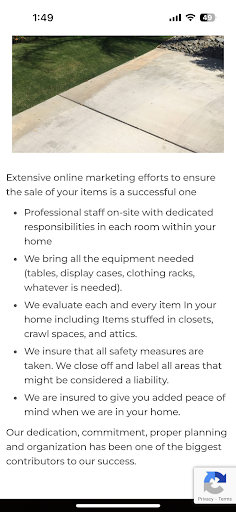 On the morning of the sale before we even started, Mark and Steve were arguing about money and Mark left never to return. At the end of the very disorganized and hectic morning, MANY items were stolen and unaccounted for. After several emails in which I presented MY list of those dozens of items, Mark and Steve got on a phone call with me and admitted that things "must have walked out the door". They said "that was to be expected"! I would never have imagined that! Why should I?Collectibles, autographed photos, cameras, other expensive items were gone. It was apparently a "free for all" and their reseller clients; the people who they are really holding these sales for. Flowers were ripped out of garden pots and I was appalled at how disrespectful people were. There was a blatant disregard for my items, many sold for a pennies on a dollar, many more stolen, destroyed and thrown in a dumpster. This was not expected and I ended up with a big bill, a small credit, an argument and lost collectibles. What they deserve is to end up with a law suit for negligence, misrepresentation and loss of personal memorabilia. My realtor, who referred them, was informed to NEVER refer them to anyone again. They are...