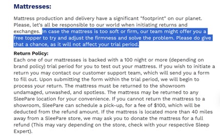 READ BEFORE YOU BUY A MATTRESS THROUGH SLEEPARE Edit after 3 months: We were sold the Helix Midnight mattress at the showroom with the pretense that we can switch out the topper (debating between 2 firmness levels). And if it still didn't feel right, we can return it within the 100 days. We requested the firm topper after a month since the bed was too soft. They sent the topper and we still found the bed was caving in as we sat in bed, woke up with neck and back pains like never before. Honestly think the mattress on the Helix is just too springy and unsupportive and it was expensive. We wanted to return the mattress within 2 months of delivery. Corporate customer service is really unprofessional, it takes a week to reply to an email, I've left voicemails on their customer service line as no one answered and never received call backs. After a few weeks we finally got through the phone line and spoke with Bruce, customer service manager. He said that we already did an exchange and our sale was final. No where on the website's return policy or on the paperwork or in any email correspondence regarding the topper request, was there any disclosure that this will lead to a FINAL sale. The website states, if your bed is too soft/firm, customer service can send a topper to solve the problem and it won't affect the trial period. I sent an email to the COO, Nigora and after a week she also replied with the same response, that I already did an exchange and they only allow 1 exchange or refund per customer. She offered to do an "another" exchange but I'm not looking to be stuck with another mattress and definitely don't want to do business again with this company. I never exchanged the mattress, only requested a firmer topper. I have reported this to BBB but just wanted any purchaser to be aware of the bait and switch and play on words with their return policy. I still expect to receive my refund and have this mattress picked up from my house. I am spending a lot of time and frustration for my right to return for a refund. Unfortunately, they are not holding up their end of their return policy "Try ANY Mattress For 100 nights. Free Returns. No Regrets. Guaranteed. We want you to be 100% satisfied with your purchase." Original Post: Great place to see online mattresses. Patrick was very helpful, no pressure, just knowledgeable. If you find any lower price online, they will beat it. Looking forward to our bed delivery! We went with the Helix...
