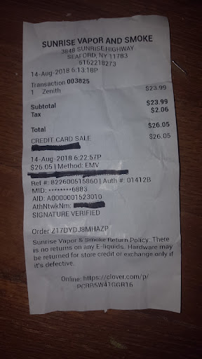 Read moreGuy behind the counter was not knowledgeable about the e-juices or coils he had. They sold vapresso mods and atomizers but did not carry any of their coils. He said that vapresso coils are very hard to find (even though I can get them very easily at Statement Vapor) and he tried to make me buy a new atomizer setup. Ended up buying a bottle of e-juice because i was desperate. He also said the juice I bought was $19 and change after tax, but it was $23.99 before tax making it a $26.05 total. I didn't't find this out until I looked at my receipt after I had to request it from him. Bad experience and will only go back as a...