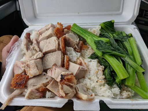 As she was filling the rice, I began to have second thoughts about my choice and almost asked her to switch to BBQ pork, but I'm very glad I did not. The roast pork was delicately seasoned with five spice, the meat was tender and there were little bits of exquisite crispy skin. The box was finished off with a bit of sauteed gai lan and a spoonful of some sort of soy based sauce right over the gai lan and rice.