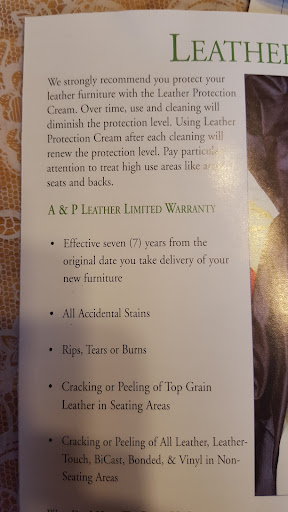 Read moreWe bought a sectionals few years ago and were convinced by sales person to buy the 7 years WARRANTY. You know just in case if anything happens with it, accidental stains, rips, peeling etc. Sectionals were fine first few years, but in one not so wonderful day it all started peeling all over. It was like there were an expiration date on it and then BAM. I'm always very careful with all my paperwork, so i kept that brochure about the coverage and found in it that we are covered for peeling. We went to the store, they sent a technician few days later ( he said we should be fine and need to wait for a call). No body called us, so my husband called them. And guess what ? customer service said that our warranty does not cover peeling. When it does.I have that brochure and it says PEELING IS COVERED. Pictures of our nightmare of a sectional and that brochure attached. Please make yourself a favor and shop somewhere else. And DO NOT BUT THE WARRANTY, It would not cover anything. All they want is to take extra money from you.