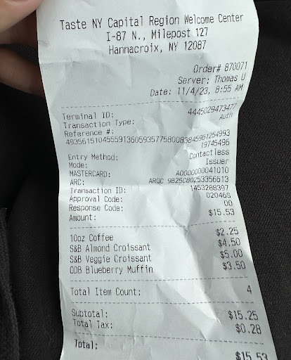 Unfortunately I did not have a good experience here today November 04, 2023... The customer service is terrible in the tasteNY, because if you buy a baked product you expect it to warn, my husband and I bought some bake goods and they delivered them cold, I had not left the store and I asked the guy who works in the store if he can warn up the food for me. And he told me that he will not touch the bag of products that he already sold and they will not heat it by order of the FDA. That has never happened to me anywhere else, I will never buy anything here again which is sad because I really like the capital region rest area but I rather go somewhere else where I can find a more friendly place to stop and get...