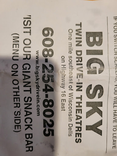 Read moreThis has been a fun summer getaway for the family! It is very simple, but worth it. It is off the beaten path from the Dells, but worth spending an evening at! They offer two movies for the price of one, they have two different screens, so you essentially have two options for the two movies you wish to see. Some people don't stay for the second movie, because it is usually past 10:30pm when it starts. They have an onsite concession stand with amazing burgers and popcorn! The only bad thing about Big Sky, which is really no fault to them, is the mosquitos can be terrible and it ruins the experience of enjoying the movie outside of your vehicle. You can easily watch and listen to the movie from the comfort and AC of your car though. Overall, I will keep going here summer after summer and catching the latest...