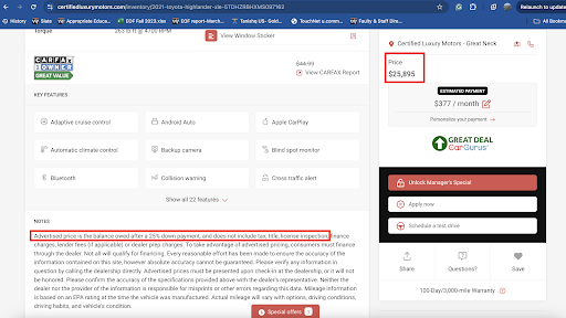 POTENTIAL BUYERS BEWARE: For those who are looking to get a fair deal on a new or used car avoid Certified Luxury Motors. This dealership advertise on various site a compelling price on various websites such as Kelly Blue Book, CarGurus etc... to lure you in only to increase the price exponentially. Let me tell you about my experience with Certified Luxury Motors Tue, 1.27.2025. I was interested in purchasing a preowned vehicle and had a budget of no more than 12k, as I did not want to finance or lease a vehicle. I didn't want any car payments or paying more than the value of the car due to the interest over the life of the loan. Certified Luxury Motors advertise a 2018 Audi Q5 2.0T Premium for $13,999. Pamela reached out to me about my interest, and sent me a text message regrding their "END OF THE MONTH SALES EVENT UP TO $3,500 OFF ON EVERY VEHICLE!!!!" I asked Pamela does the "up to $3,500" can be subtracted from the advertise price on Cargurus.com, she said yes. I thought this was great deal and I took time off work to see the Audi in person and then proceed with its purchase. Upon arrival, I was greeted by someone else by the given name of 'Bryan' and not 'Pamela'. This immediately raised a red flag. After having to retell why I am there, I was shown the car. There was some acceptable paint chipping and the interior was in fairly good condition. However, I noticed on the right front hood, there was an area with no clear coat and it was litterally pealing from the paint. This clearly suggest there was poor work done on the car which wasn't reported to CarFax. I brought it to Bryan's attention but he dimssed it. Depsite what I saw, I decided to look past it and wanted to address the price of the vehicle. To my surprise I was told that the $13,999 they advertise was only if you are going to finance the vehicle, and if I wanted to buy it in cash it would be more. I asked to speak to manager - as this didn't make any sense, and I started to see a great deception and dishonesty beginning to unfold. I express my suprise and grievance to 'Danny' the Manager. He showed me on the site where it mentioned there is a 3k + markup. However, this is not clealry mentioned on the site, but hidden in a sub menu and in small type. Danny then explained there's an additional $1,999 prep-fee. I am not sure what they prepped, as there was damages I mentioned above, and the back support and headrest of the driver seat had dirt marks. Danny then added other fees such as plates, docs etc.. where the so call finace price increase from $13,999 (lets round it to 14k) to a whopping $19,000. Thats a $5,000 increase from the advertise price. Now to buy the vehicle in cash, they said the sale price will increase to $21,000. Thats now a $7,000 increase from the avertised price. I then ask about "END OF THE MONTH SALES EVENT UP TO $3,500 OFF ON EVERY VEHICLE!!!!(BY APPT ONLY)". Danny response was it states 'up to $3,500' and he didn't want to honor the full amount, but honor less than half the amount. I asked Danny if the price was negotiable. His response was I paid about $17,256. I can't sell it below that price. This is clearly 'a bait and switch' tactic. While there, I did a search on this dealership. You'll see there are many complaints from other potential buyers on sites such as Kelly Blue Book and CarGurus about their bait and switch tactic. The reviews are spot on and they have a 2.7 rating on CarGurus. Don't waste your precious time and travel to see these people. Avoid this dealership like the plague. Guaranteed you'll be very disappointed. They are dishonest and deceitful. They don't have your best interest at heart, nor are they willing to be flexible to work out a deal. Their only concern is to get you into their dealership, have you develop an emotional attachment to the car of your choice so they can get as much as they can from you and direct you into a loan where they and banks will profit at your expense.