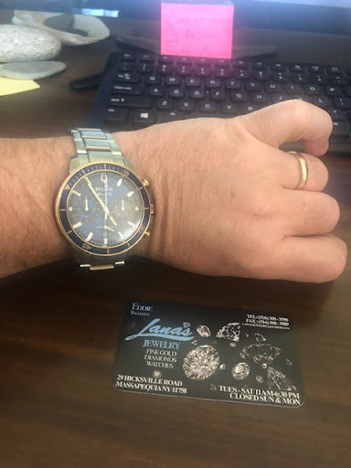 What a great find! I told Eddie (owner) that when my daughter Molly comes home from NJ again, I'm taking her and my wife back to LANA'S to pick at least one thing out. This store has all the fine expensive stuff (motherly?) that my mother and sisters (Garden City) would love, but it also had a fair share of silver that is funky, chic, and more current, which my Baldwin wife will LOVE!!! You see, I want to give back to Eddie who really helped me today - with no fuss or fawning. At age 61 (GCHS '79) I recognize AND TOTALLY APPRRECIATE when I find anyone in a helping position to be knowledgeable, nice and normal, lol. I have only one piece of jewelry, a Bulova watch, which I treasure as it's a gift from my fellow nurses when I left St. Mary's Hospital for Children last September. The wristband separated from the watch and although it's still under warranty, I didn't wanna ship it out to CA right away. Two weeks ago, my haircut guy, who dabbles in jewelry/watches, said only Bulova has the needed part. Thankfully, I popped into "LANA'S JEWELRY" today after leaving Uncle Giuseppe's. Kind, good guy Eddie told me if I had a spare link from the band (I did!), that he could take that apart and fix it. I quickly went home and Eddie did just that. I was still scared he might charge me a hefty price, but he charged me less than what I thought was fair to him. So . . . that's why this non-shopper is writing his 1st google review. Go to LANA'S JEWELRY in Massapequa by All-America Hamburger. They have beautiful stuff, cool stuff, and a great guy...