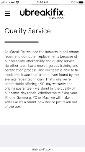 Read moreI went to this place to have my IPAD repaired. Front desk guys were nice and they seemed to know what the problem was and said they would try to fix it. They gave me 20% off for joining the Asurion home tech insurance, which I thought was great as I could Cancel anytime. Anyway part of that monthly fee is being able to clean desktops diagnose slow computer etc. so I took advantage of that free service and brought my iMac in. So I finally get the IPAD and he says sorry I left some hair under the screen I’ll take care of that. Unfortunately the original problem on the iPad couldn’t be fixed and I don’t fault them for that. I come back after a few days and I get the iPad back and it’s dirty. You would think they would at least hand the item back with a quick clean of the screen to make their service look good. I take it home and notice there is new dust particles under the screen! If they had taken the time to clean the screen they would’ve seen it so no quality control. I take it back and the guy smiles and says I’ll get it fixed up in 45 min. The iMac was “serviced” with nothing about what they found or why it was slow until I asked them specifically what was wrong and he says there were a bunch of updates pending which were done, couldn’t find anything else. Just like the iPad the screen wasn’t cleaned and looked dirtier than when I gave it to them. What happens when I plug the computer in at home? It needs an update of the software and other updates. So I have no idea what they did. At least it was free. But I have a feeling they rushed it because I was calling for a week to ask what was going on with the computer. I think maybe each store is different with who it is manned by, and they say they are short staffed. But when I call about my computer or product and they cannot find it, it’s a problem. When they are complaining to me over the phone about how someone should’ve put a work order on it etc…. It’s never good for employees to complain to customers about the problems the store is having. Overall not a professionally run place, and they could take more pride in the end product. Heck at least clean the item off before you hand it back to the customer. I would not recommend this particular store. I use Asurion thru Verizon and it’s always been excellent but I think the individual stores are...