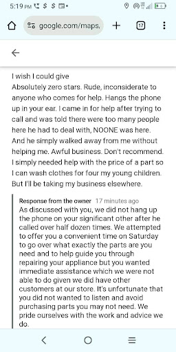 Ā Ā Ā Read moreI would rate it no stars if I could. I called to simply inquire about a replacement burner element. The guy who answered the phone was incredibly rude and practically starting yelling after I asked if they carried them. Instead of simply asking if I knew the part number or model of my range he rudely stated after an awkward lengthy pause after my question, "Well you got to tell me more then that, Jesus.. cant' do anything with just that". So I politely said I was waiting for his answer and him to ask if I knew the part number. Then I get a grumble and he hangs up on me. I couldn't believe it. Then of course I try calling back in hopes of maybe getting someone different and the phone simply rings and goes to the answering machine. So much for trying to support local...