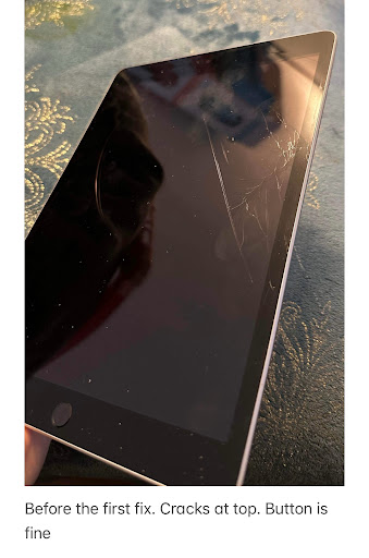When they called me to pick up the IPad and said it was all fixed. I drove home, sat down to put the iPad in the case and noticed the screen was pushed out on the bottom right of the iPad, the touch screen was not working and the screen had waves inside. (See the photo)