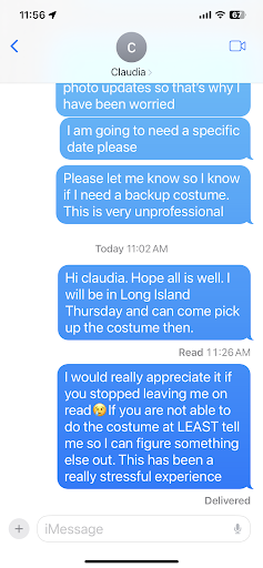 Do NOT purchase from Claudia. I met with her Sept. 20th for a costume to be done by Oct. 20th(one month). Claudia said she will have it for me way before then and will be sending me photos along the way in case I need to make any alterations. I met with her, we took my measurements and she ordered materials. However, I had been texting her asking for pictures after not hearing from her for weeks. She continuously left me on read until I told her I am gonna buy another costume instead. She TOLD ME not to and that it will be done soon, yet still would not send me pictures. It was not until 4 days before it was supposed to be done that she told me to go somewhere else because she does not want to be harassed. What am I supposed to do???? Just wait until oct. 20th and not say anything???? I had not been hearing from her and was so excited for this. I am not even celebrating halloween anymore because I don't have my costume. I am beyond sad and upset with my experience. She could've just told me she didn't want to do it and I could have gone somewhere else. DO NOT BUY FROM HERE COMPLETE SCAM AND...