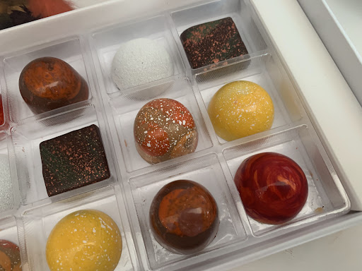 Last Saturday my daughter and I attended our first-ever chocolate painting class. It exceeded our expectations, as we created a memorable and lasting experience. When we arrived at the boutique-style Atelier Disset store, we met other participants and were greeted by our host Cristina. She introduced us to the chocolate artist Ursula, who proceeded to explain all the details about the workshop. Ursula was extremely attentive in answering all our questions but, at the same time, allowed us to express our artistic side. At the beginning of the session, we were all a little hesitant, but Ursula created a nice and relaxing environment by telling us stories that are inspiring her products. It was interesting to see the results of our work that represented all our different personalities. Both my daughter and I felt the Fall inspiration and we had a lot of fun experimenting with all the different natural colors. Thanks for all the refreshments and for the opportunity to enjoy high-quality chocolate. The best thing is that I will continue to savor my “masterpiece” for a while...